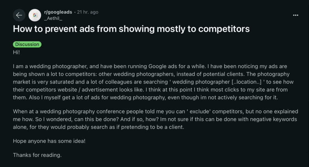 I came across a Reddit post a few months ago that made me wonder about the real scale of this recurring problem — how do we make sure our ads reach potential customers rather than competitors from the same industry? This topic is especially relevant for local service providers and small businesses, where every advertising euro matters and choosing the right channels can make or break the results.