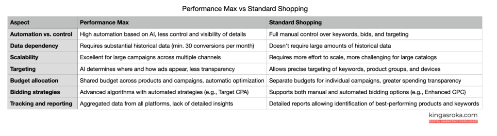 Compared to Performance Max, Standard Shopping requires more manual control, allowing advertisers to handle targeting, bidding, and ad placements more precisely.